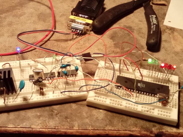 Programátor s napájecím zdrojem (vlevo) a programovaný obvod (vpravo), ve kterém právě běží čerstvě nahraný testovací prográmek.