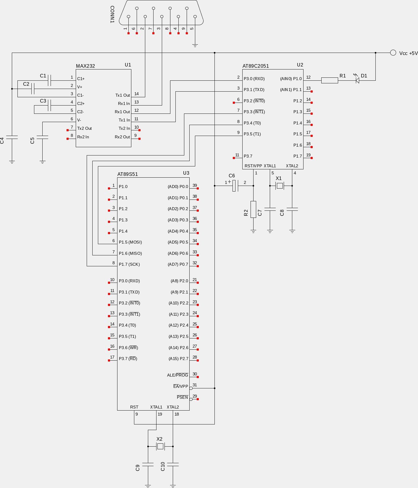 Pro prvotní vymanění se ze závislosti na svém PATMELu (a tím i na redmondském neřádu) jsem si vytvořil jednoduchý prográmek pro obvod AT89C2051 a k jeho nahrání do obvodu jsem použil právě PATMEL (doufám, že již naposledy). Dále jsem napsal prográmek v C++, který s tímto obvodem komunikuje přes rozhraní RS232 závratnou rychlostí 1200 baudů. Ne, že by to nešlo rychleji, tato rychlost se mi však osvědčila i v různých "neideálních" prostředí dlouhých kabelů a dalších překážek, přes které nutím bajtíky přelézat při svých experimentech.